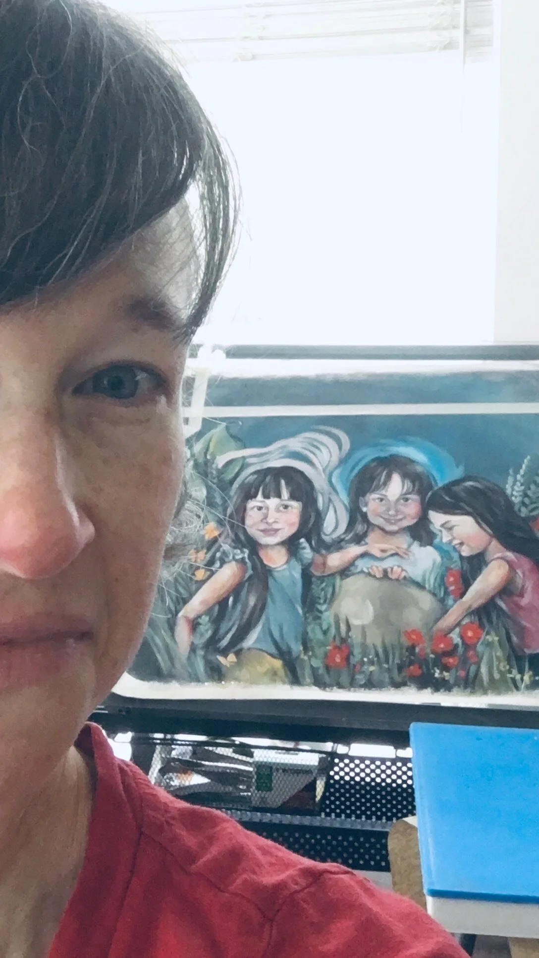Multiple foxes frolic around the boundary edges of the vineyard and the banner in the middle of the image is written in Hebrew: His banner over me is love.